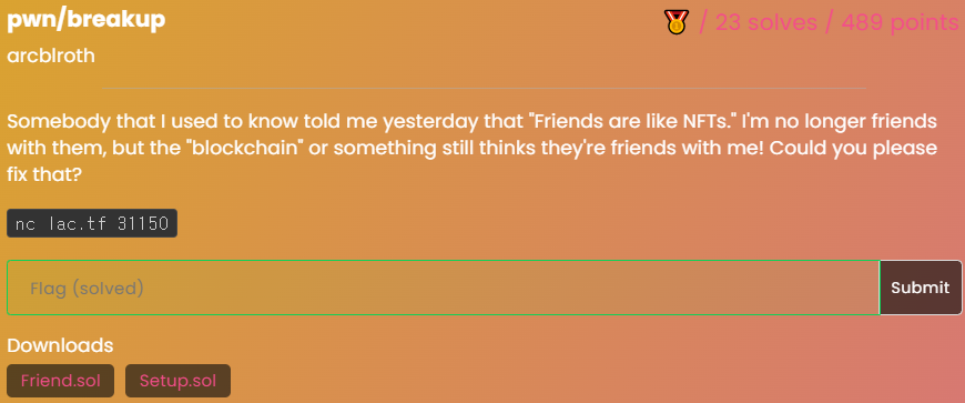 w3 = Web3(Web3.HTTPProvider("https://breakup.lac.tf/774b5c90-e954-45d0-947c-e7b50f9b841c"))